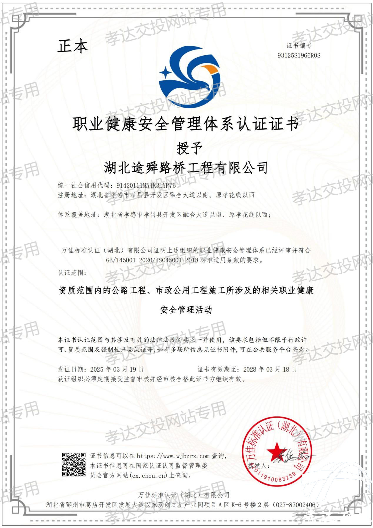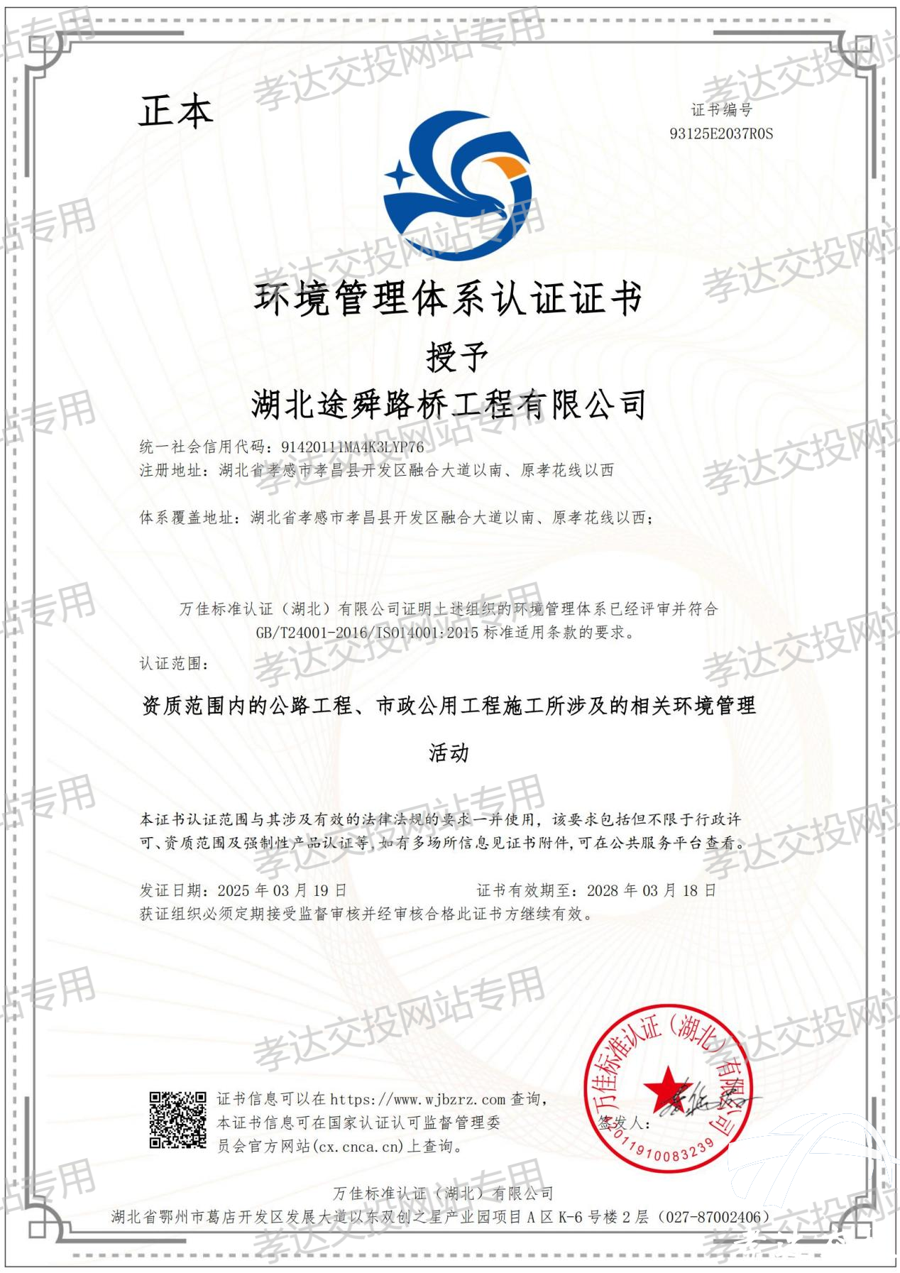 3月19日,孝達(dá)交投全資子公司——湖北途舜路橋工程有限公司,在順利通過中國(guó)質(zhì)量認(rèn)證中心萬佳標(biāo)準(zhǔn)認(rèn)證中心《質(zhì)量、環(huán)境和職業(yè)健康安全管理》三標(biāo)體系認(rèn)證審核后,取得三標(biāo)管理體系認(rèn)證證書。