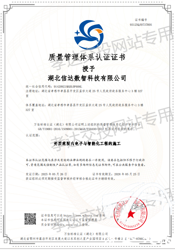 近日,湖北信達數(shù)智科技有限公司順利通過管理體系認(rèn)證,標(biāo)志著數(shù)智公司在標(biāo)準(zhǔn)化、規(guī)范化、精細(xì)化管理方面邁上新臺階!